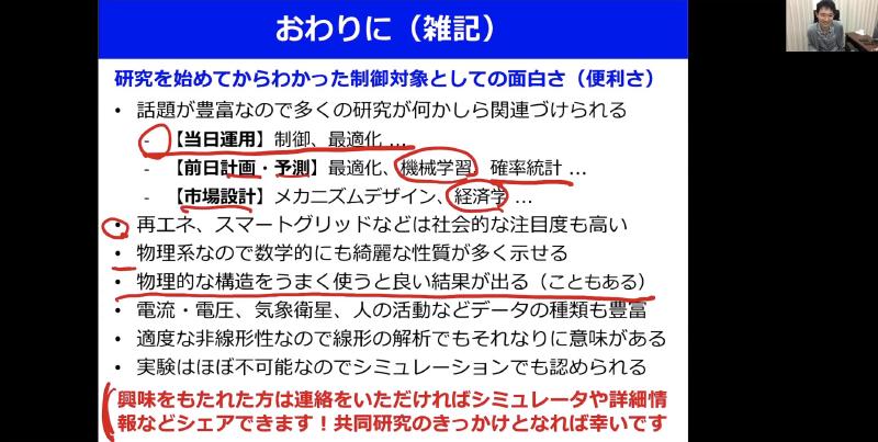 に向けて、電力系統モデルの数値シミュレーションや数理解析に必要となるであろう最小限の基礎知識を提供します。また、標準的なモデルを対象にした数理的な解析の結果から、電力系統モデルが物理的にも数学的にも興味深い性質をもつことを紹介します。具体的には、非線形の微分代数方程式により記述される電力系統モデルが、ある条件のもとで等価な常微分方程式系に変形できることや、ある入出力に関して平衡点に依らない受動性をもつこと、各発電機の周波数が漸近的に同じ値に収束することなどを示します。さいごに、講演者らが提案する制御手法を実際に電力系統モデルに適用した結果を紹介し、データに基づく予測や制御に関連する研究課題などを議論します。